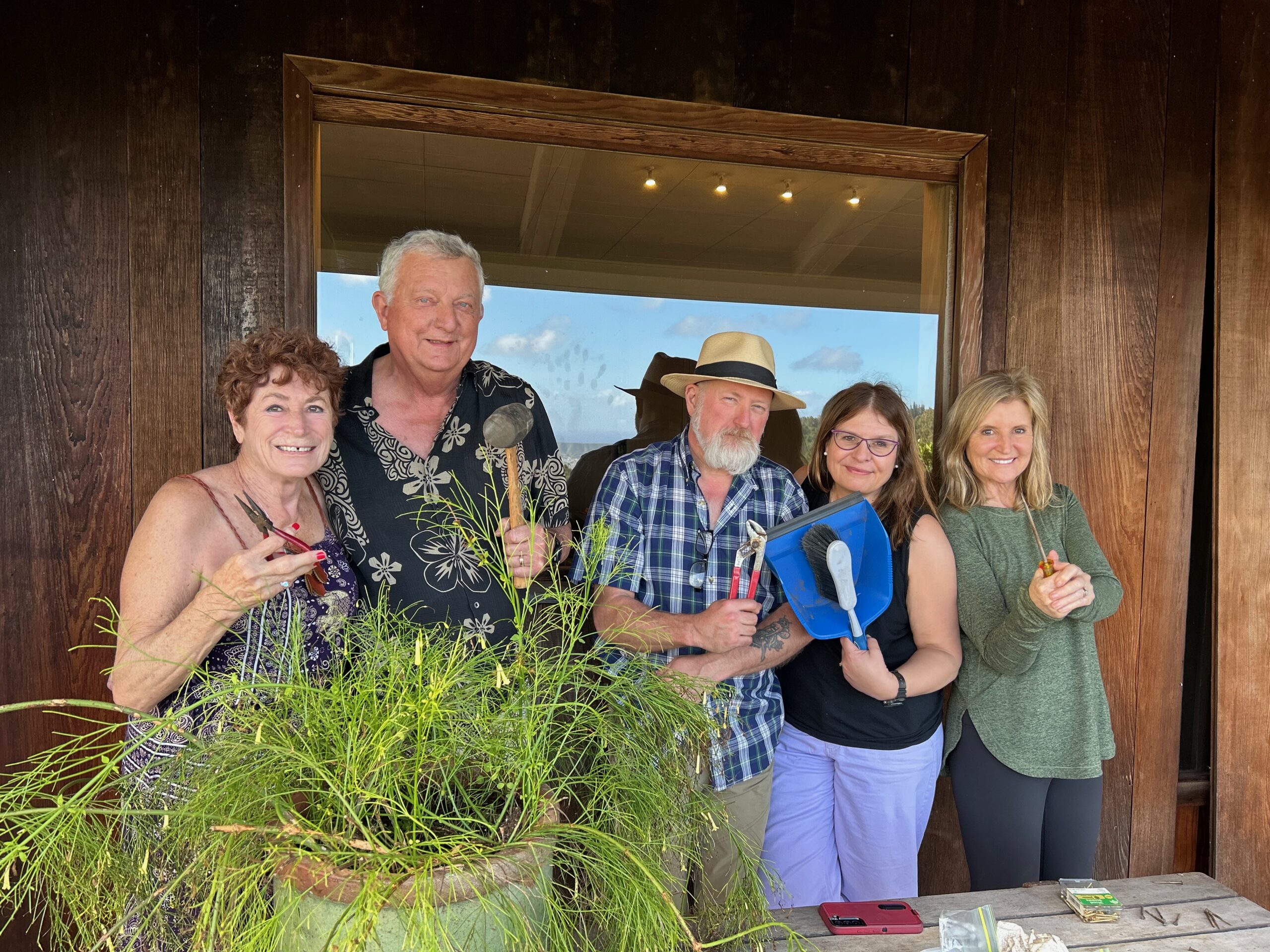 In mid-February, Dave and Liz returned for a Hawaii vacation, this time with their friends Brian and Elizabeth. All four spent an entire day at the house, working on the window with Dave serving as lead engineer and Brian, Liz and Elizabeth providing expert assistance. For the first time since Howard installed the window, the entire exterior wall was taken apart to better see what was happening inside the wall with the pulleys and weights. The window is now operable though there are still some kinks to be worked out. Despite having returned home to the mainland, Dave is committed to devising a more permanent solution to keeping the window operable so stay tuned for an update in our decades long window saga! A giant mahalo to Dave, Liz, Brian and Elizabeth for spending a treasured day of your vacation at Liljestrand House!